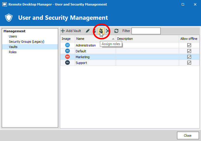 - From the User and Security Management window, click Vaults and then click Assign Roles.