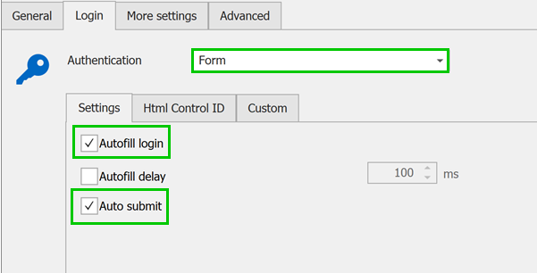 - In the Login - Settings tab, set the Authentication to Form. Then, verify that the Autofill login and Auto submit options are enabled.