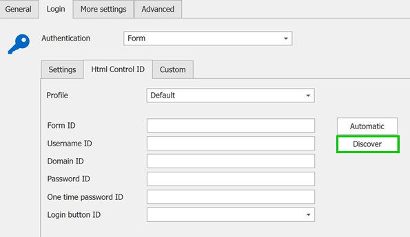 - In the Html Control ID tab, click the Discover button to define the appropriate fields. The Discover command searches the web page to find the fields that correspond to those in the entry.