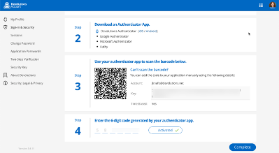 Authenticator App supports Devolutions Authenticator, Google Authenticator, Microsoft Authenticator and Authy. Scan the barcode, enter the 6-digit code, and then press complete.