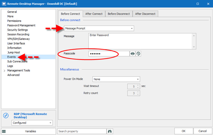 Go to the Properties of your selected RDP connection and click on the Eventsside menu.