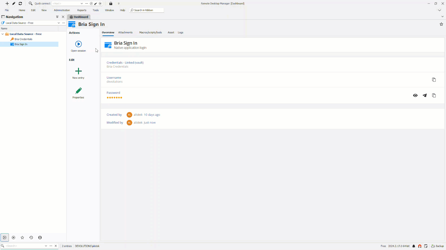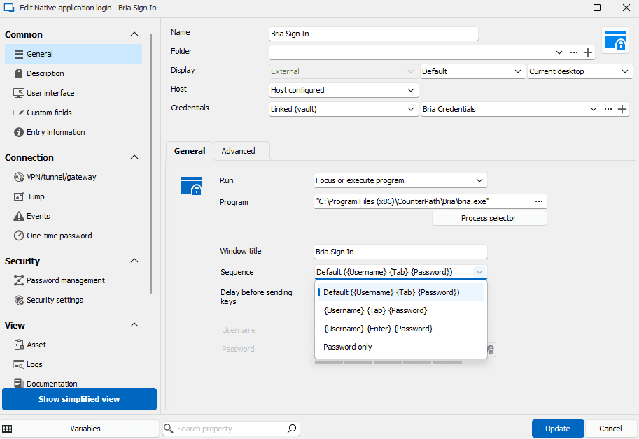 As an alternative to the Open session button, with the Bria application in focus, hitting Ctrl+Space on your keyboard will bring up the universal RDM Quick Search. The Bria window is then automatically detected and credentials are filled. Save yourself time by automating your native application logins through RDM!