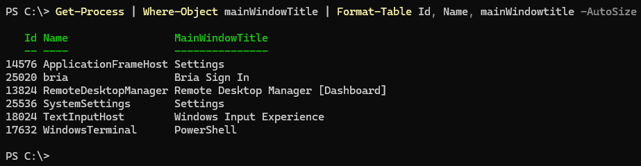 1- Get-Process | Where-Object mainWindowTitle | Format-Table Id, Name, mainWindowtitle -AutoSize