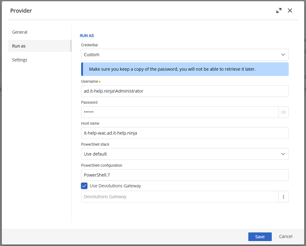 Microsoft.PowerShell, which runs in the older Windows PowerShell 5.1 environment. You can also specify a configuration likePowerShell.7, which runs in the recommended PowerShell 7 environment. - Choose to run the provider over a specific Devolutions Gateway instance.