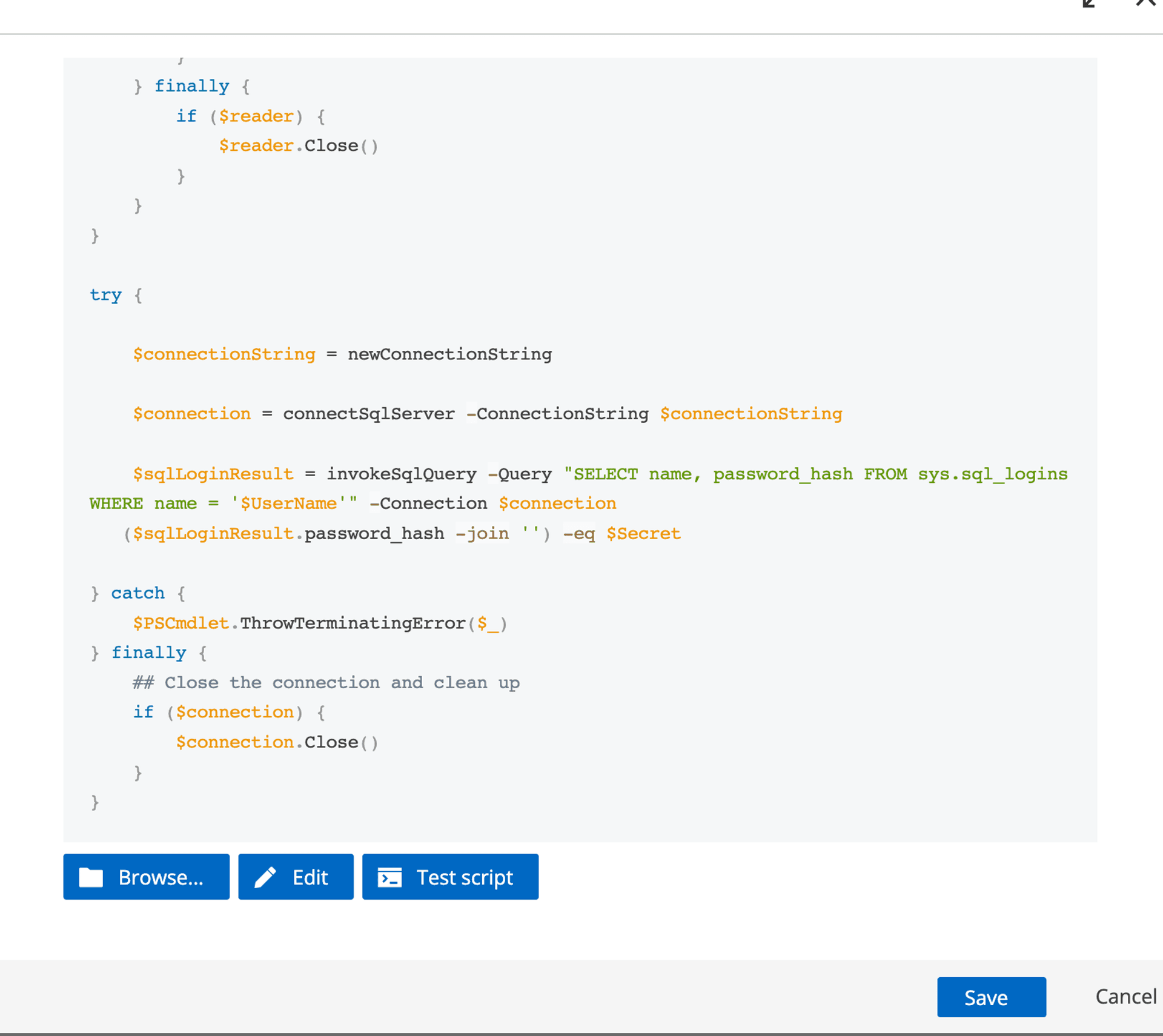 For example, perhaps we are looking at a trimmed-down version of the [SQL Server Login heartbeat script](https://github.com/Devolutions/PAM-Providers/blob/master/Providers/sql_server_login/scripts/heartbeat.ps1).```