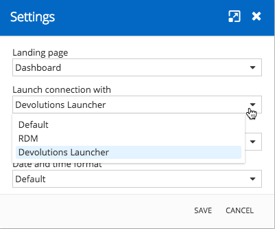 Click on the Launch Connection withdrop-down menu, select Devolutions Launcher, ** **and then click Save.