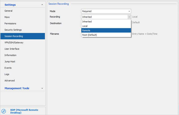 Please also note that session recording is not yet supported by Devolutions Launcher. As such, to use it you will need to log into your Remote Desktop Manager instance and launch the session from there.