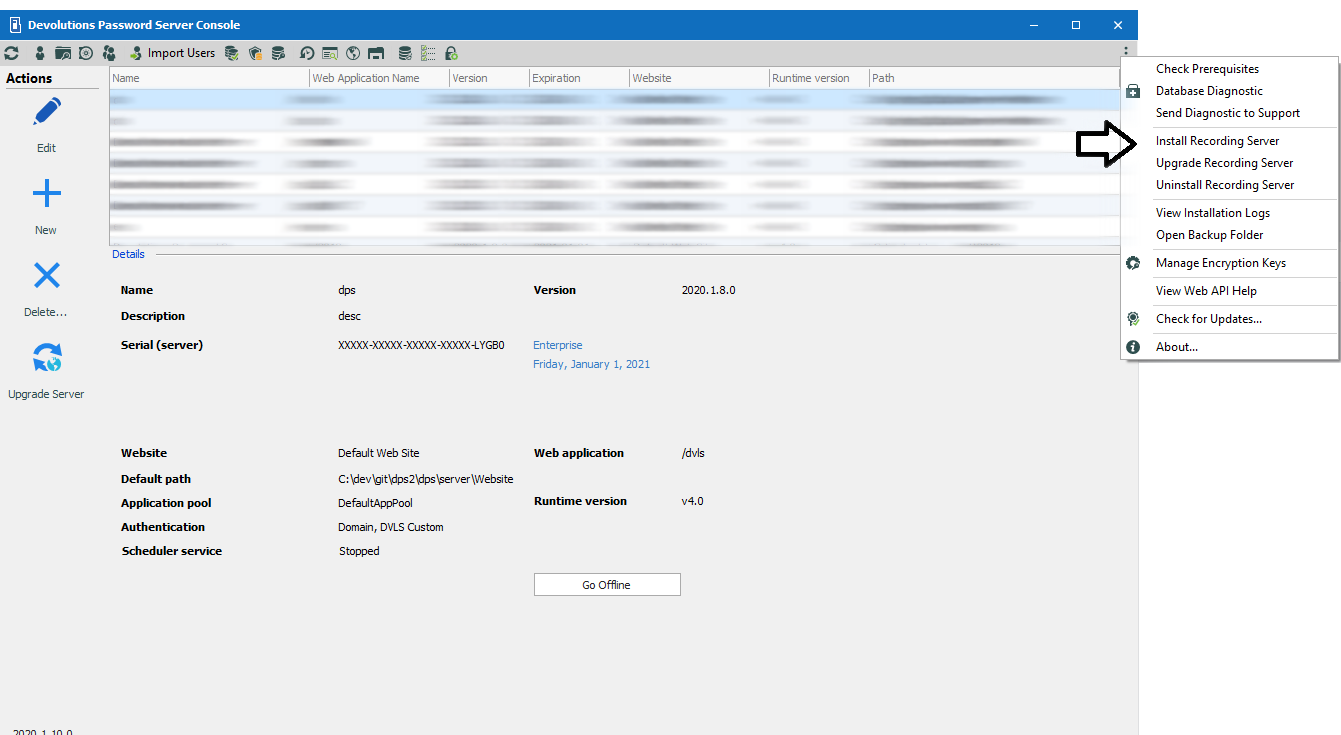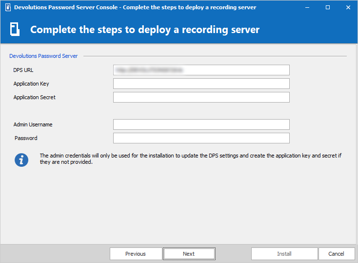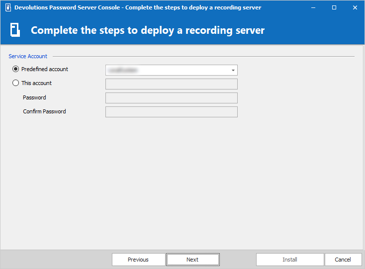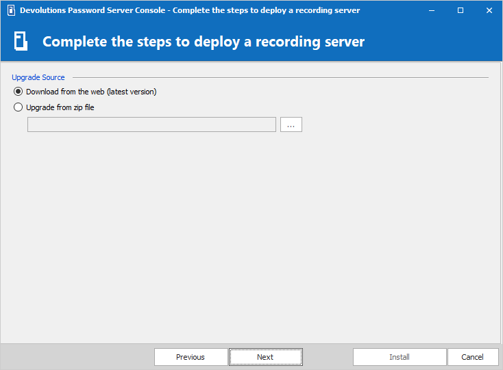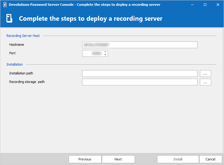 Select the Install Recording Server option in your Devolutions Password Server console. You’ll then be prompted with the following steps to deploy a recording server:
