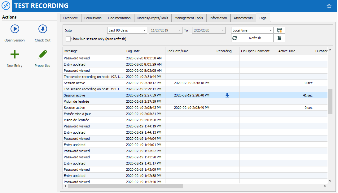 The processor (Remote Desktop Manager) automatically monitors a folder in the collector (Devolutions Password Server) to see if there any new video files. If there are, the new files will be automatically added to the session’s log entry. Simply click the down arrow to download and view it.