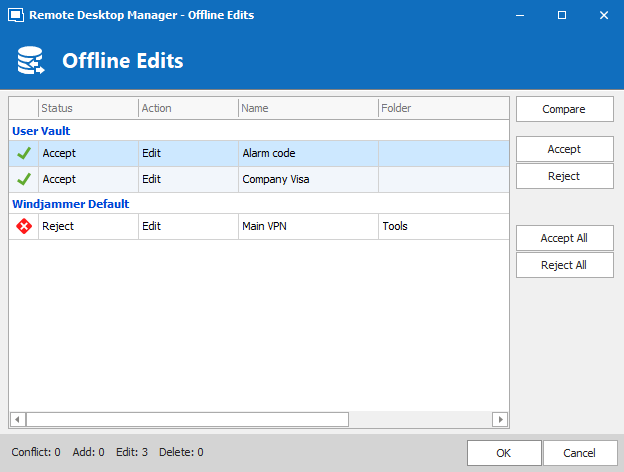 In previous versions of Remote Desktop Manager, you could modify your Private Vault entries offline. However, once you went back online, you did not have the ability to prevent the changes from synchronizing — they would just happen automatically. Now in the re-imagined User Vault, you have full control to decide which specific offline changes you would like to synchronize. You can also compare changes and accept all/reject all.
