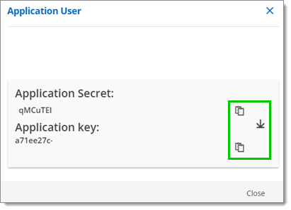 Note: It is very important that you keep the Application User credentials secure, and in a location where you can find it. Once you close the window, you cannot retrieve these credentials.