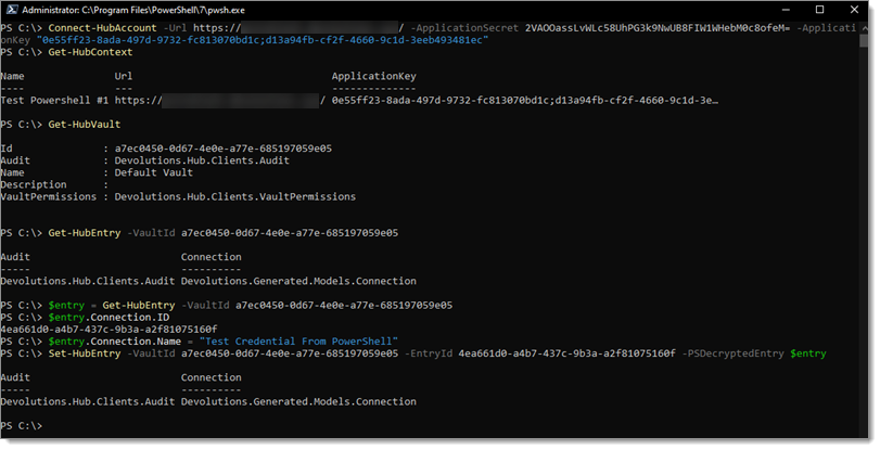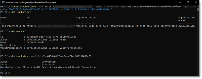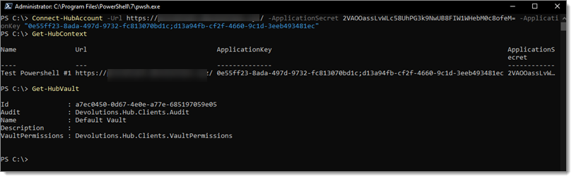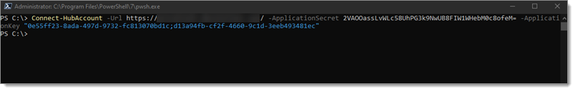1Connect-HubAccount -Url https://yourhub.devolutions.app/ -ApplicationSecret [YOUR_APPLICATION_SECRET] -ApplicationKey [YOUR_APPLICATION_KEY]