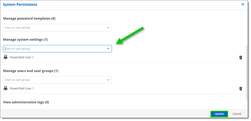 Step 2: Add your Application User by selecting them from the drop-down menu next to each System Permissions that you wish to grant. Then click Update to save.