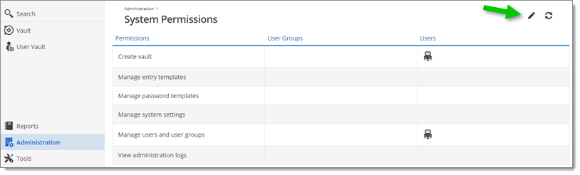 Step 1: In Administration - System Permissions, click on the edit pencil icon to set permissions.