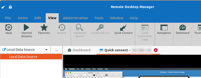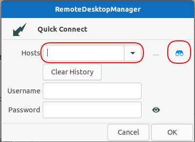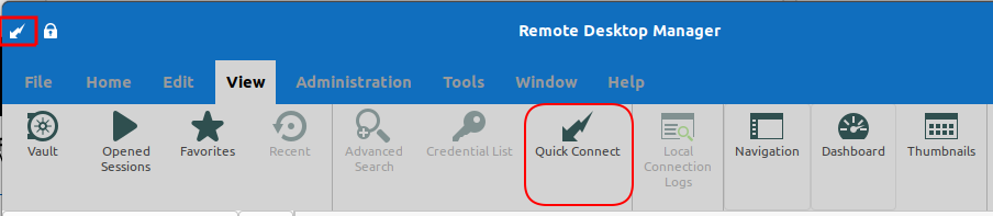The Quick Connect feature is accessible from the menu View - Quick Connect, or via the Quick Connect icon located in the Remote Desktop Manager for Linux toolbar.
