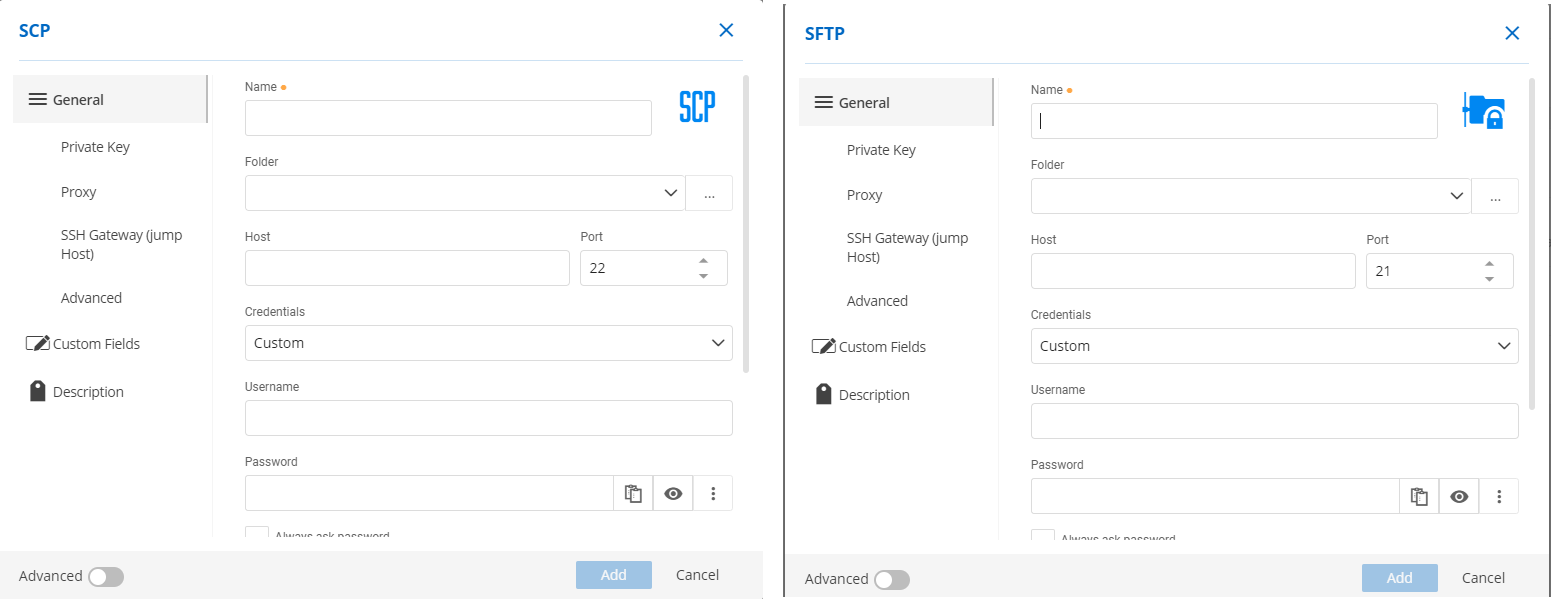 Password Hub Business now supports new session entries in the web interface, SCP & SFTP. SCP (Secure Copy Protocol) is a means of securely transferring computer files between a local host and a remote host, or between two remote hosts. SFTP (SSH File Transfer Protocol) is a popular method for securely transferring files over remote systems.