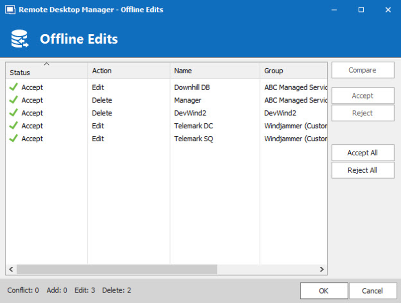 - Select the changes you wish to Accept and those you wish to Reject. You can also use the Compare action for a side-by-side comparison of your offline changes vs. the current live entries.
