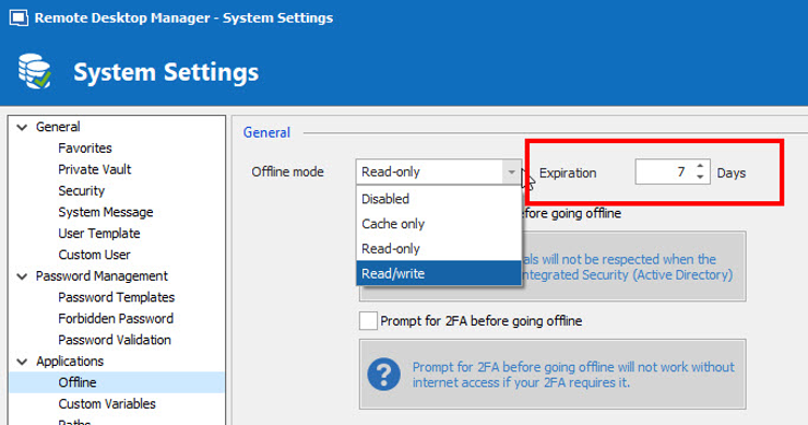 Please also keep in mind that for added security, offline files are set to expire after a certain time period. The default duration is 7 days. However, you can adjust this by going to Administration > System Settings and changing the number in Expiration to whatever you wish.