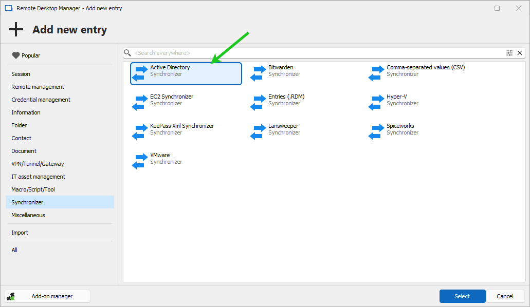 - Create an AD synchronizer entry: Open RDM and navigate through Edit > Add new entry > Synchronizer and select the Active Directory synchronizer. Alternatively, you can add a new entry from the dashboard.