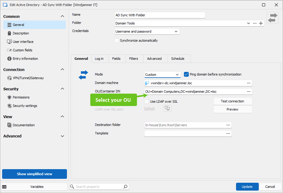 - Test your sync: Run a test sync to ensure that everything is set up correctly. Verify that servers and computers from AD are appearing in RDM as expected. In the properties of your AD sync, you will find a Preview button in the General tab.