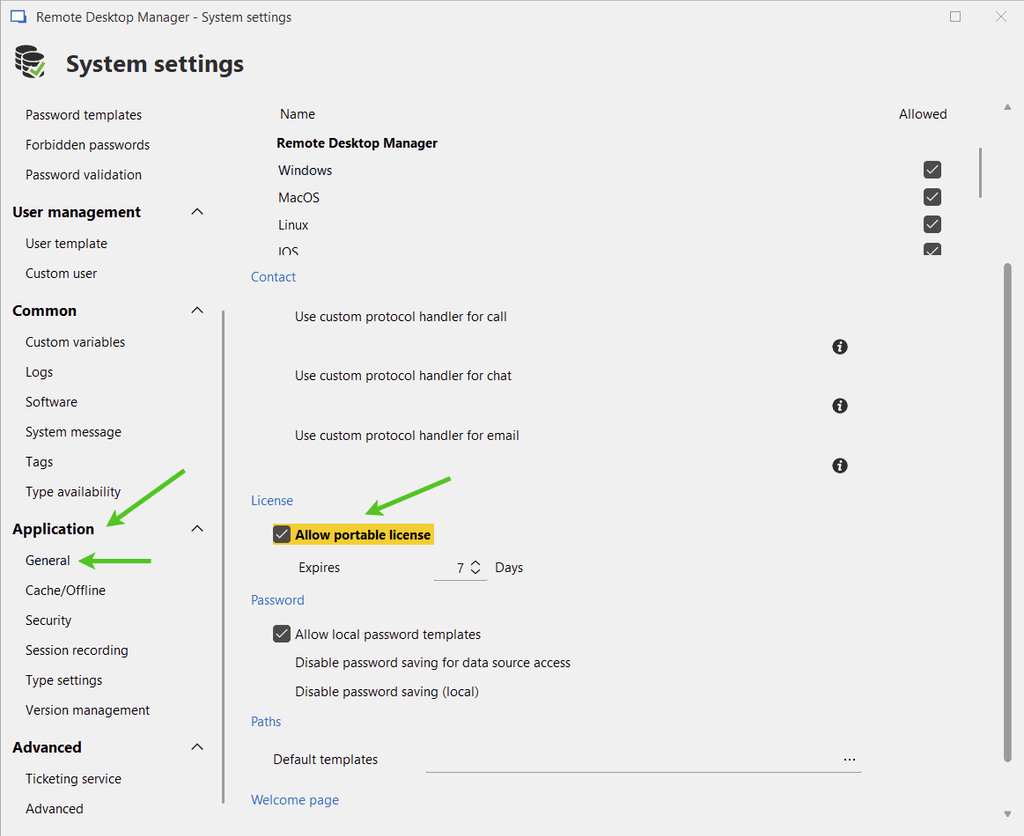 To enable the use of portable licenses in RDM, navigate to Administration > System settings > Application > General and select the checkbox labeled Allow portable license. Below is an example for SQL.