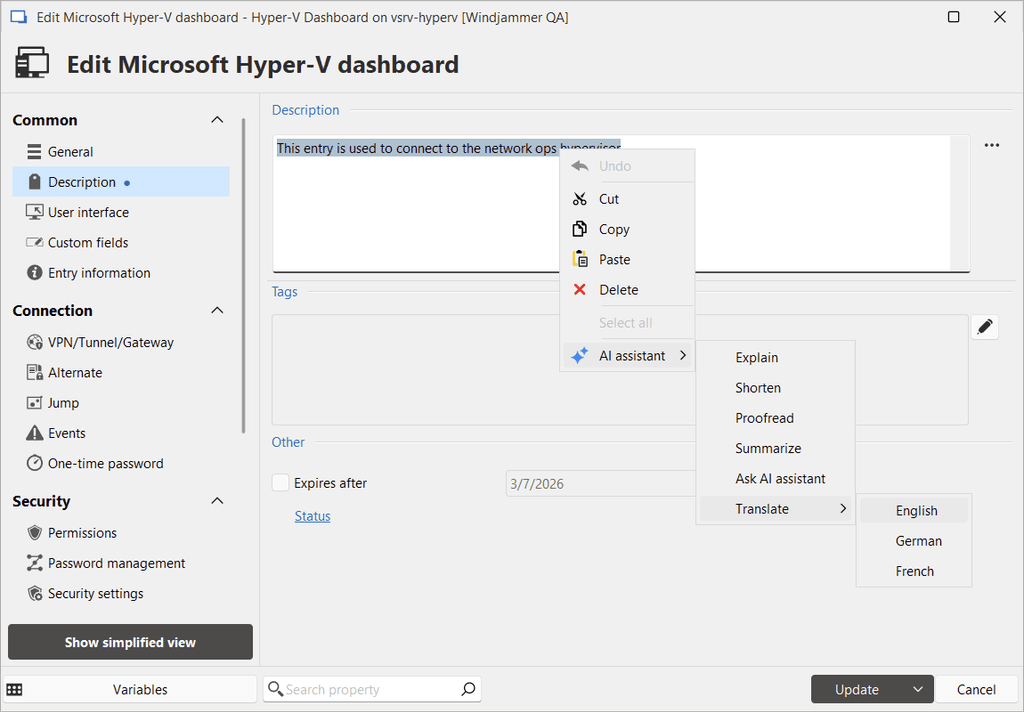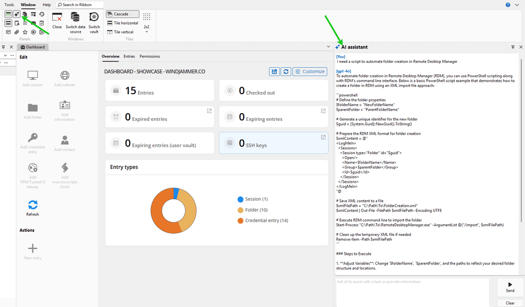 Using the AI assistant in RDM is easy and can be used in several places. Simply add a new entry and select the AI assistant. Use it in the description of an entry to translate or proofread, among other tasks. Use the assistant in PowerShell for help in enhancing and explaining content. Finally, you can also use the dedicated AI assistant chat window from the Window tab for quick access. Configure your preferred AI model using the settings via File > Settings > AI assistant.