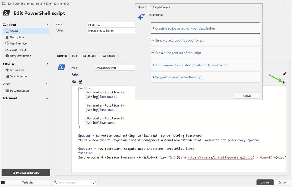 To help IT professionals streamline their workflows, Remote Desktop Manager (RDM) 2025.1 now includes an AI assistant — a powerful tool powered by Microsoft Semantic Kernel — designed to assist with various tasks such as proofreading, translating, creating comments, generating and improving scripts, and more.