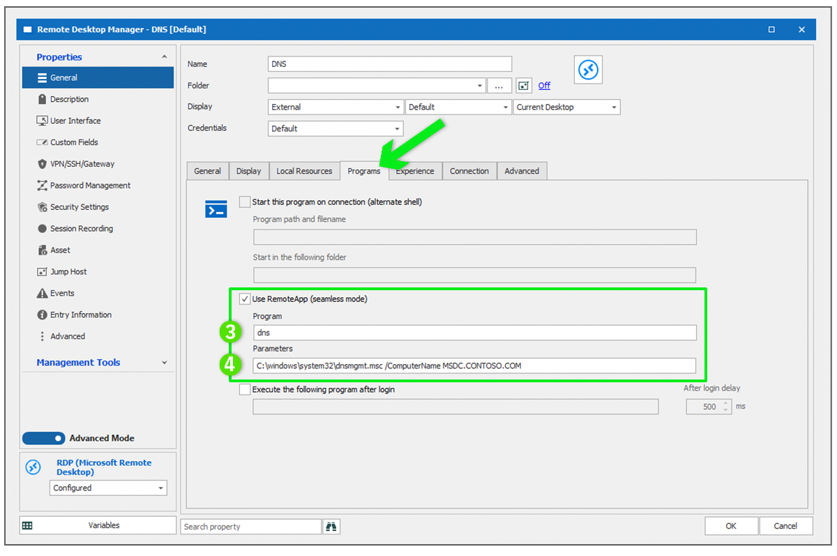 On the RDP host entry, click the Programs tab.