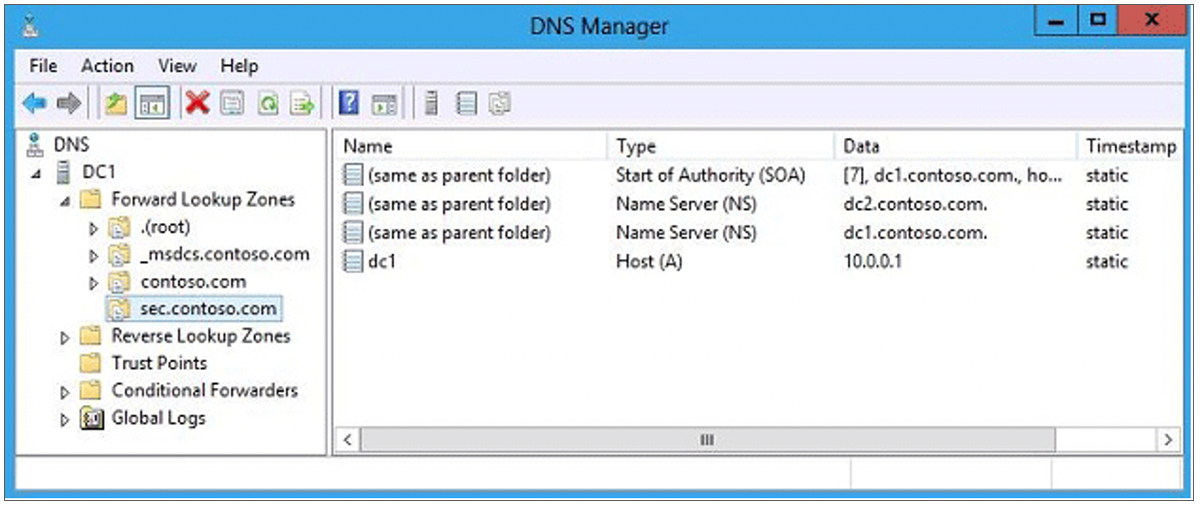 In the example below, the DNS application is installed on the server RDS-SESSION.CONTOSO.COM — and so that is the server address we will use for the host entry.