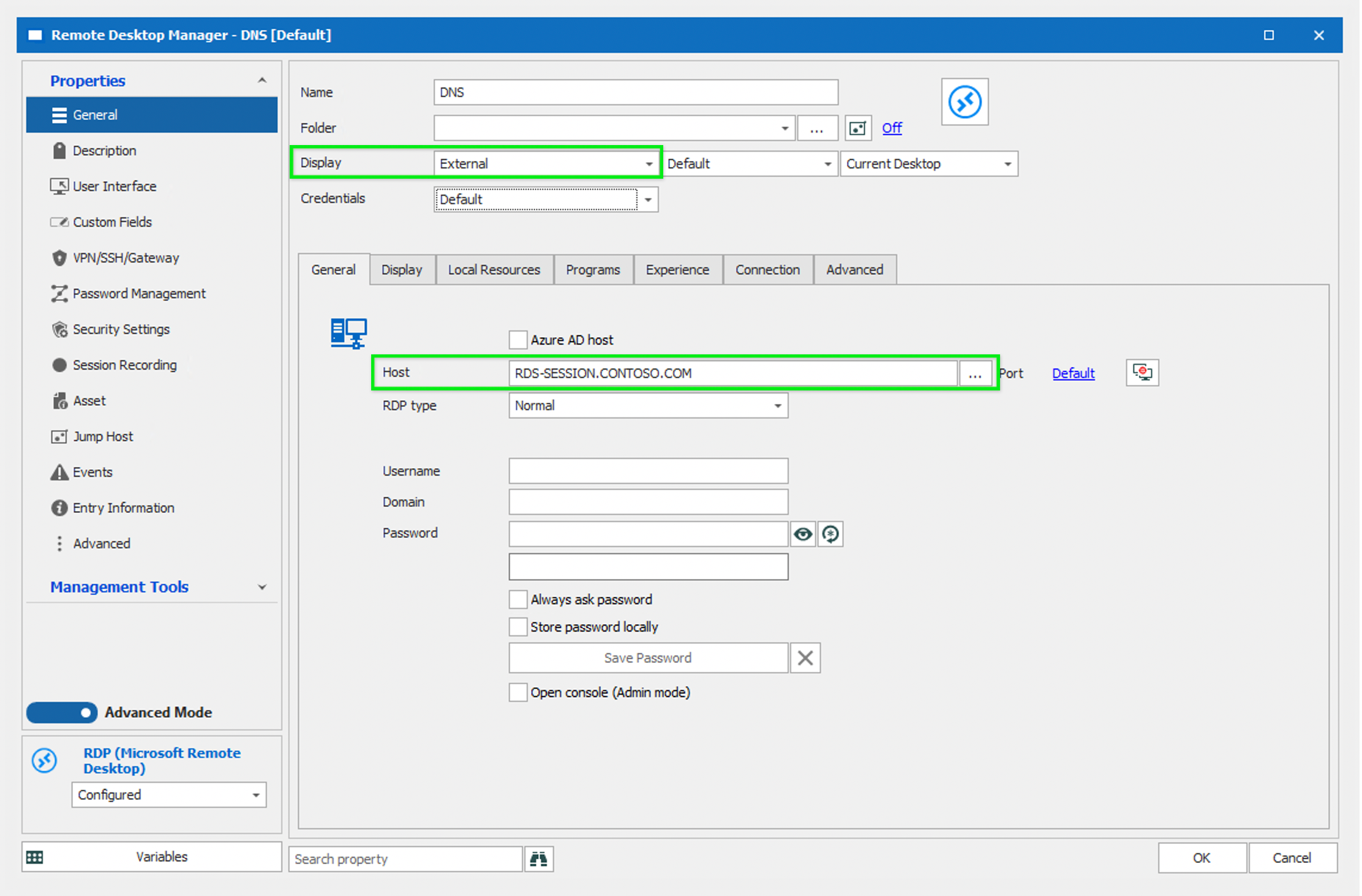 However, when you create a new RDP host entry in Remote Desktop Manager, if you attempt to use the same configuration as the RDP file that was downloaded from the RDS website, it will fail. To avoid this, Remote Desktop Manager needs to be pointed to the session host server that hosts the application you are attempting to launch via RemoteApp.