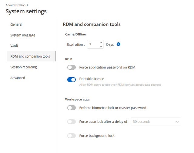 A portable license allows a time-limited reassignment to a specific data source. Great for MSPs that manage other Hub instances for customers, portable licenses avoid the need for an MSP to have a license for each. Under Administration > System settings > RDM and companion tools, you can configure portable license availability.