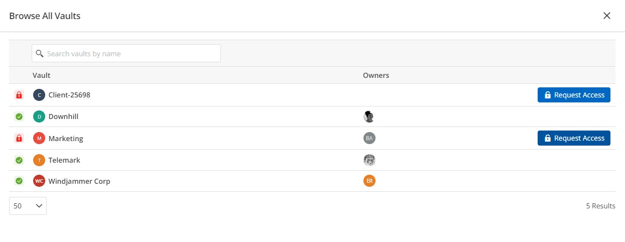 Users can now request access to a shared vault that appears in their list of public vaults (see note below).