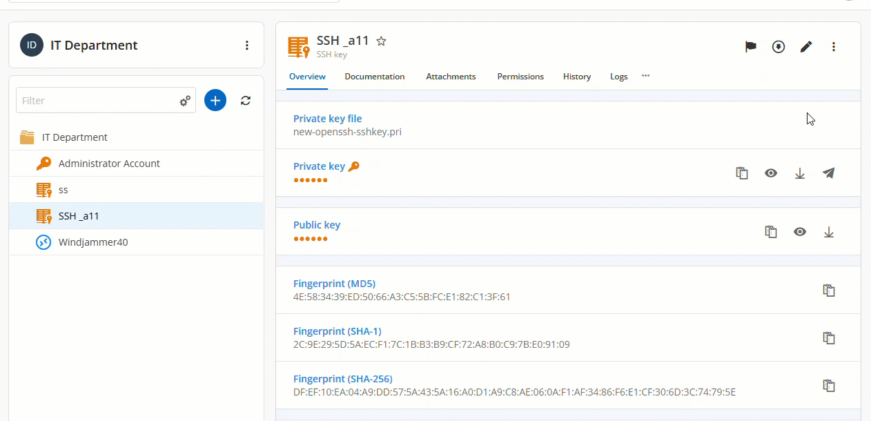 Managing SSH keys has become more efficient thanks to the redesigned SSH key entry. In addition to importing an existing private key, you can now generate one directly when adding the entry in Hub’s web interface. After adding the entry, you can access all necessary actions in the entry’s properties: generate a public key, or even download the keys in your preferred format!
