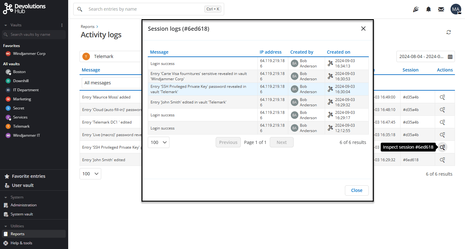 Activity logs now include an Inspect session button which displays all activities within a specific user’s login session, now represented by a session number. These enhancements allow administrators and managers to monitor activities with greater precision during specific user sessions, whether accessed through the web interface, Workspace, or Remote Desktop Manager.