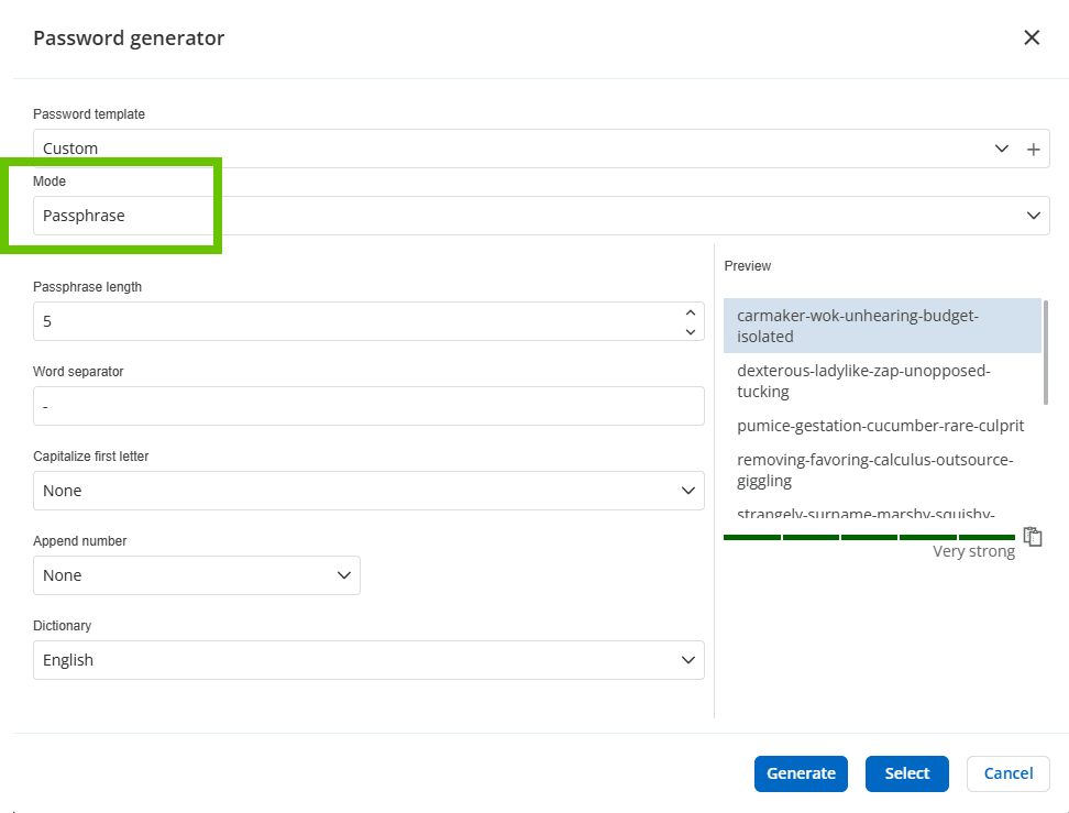The password generator can be accessed from the password field or when defining a password template. Simply select the Passphrase mode and adjust the settings to meet your security needs. We currently offer passphrases in either English or French.