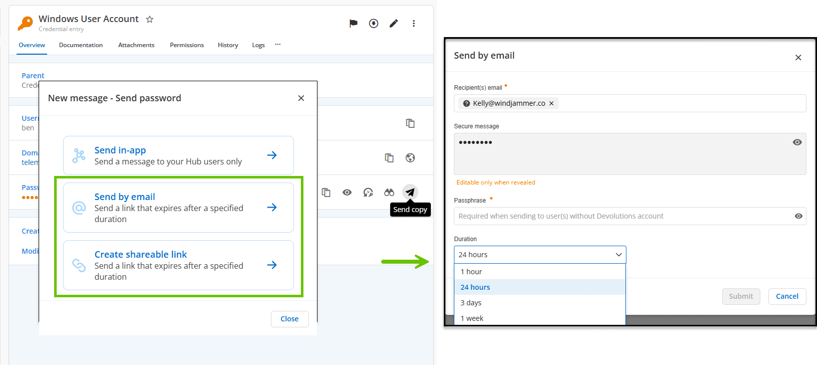 Following the recent update to our Devolutions Send service, which introduced customizable durations for encrypted link messages, we’ve extended this functionality to Hub. You can now select the duration of secure links sent through Hub, offering you more control over the security of your communications.