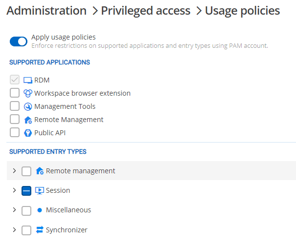Under Administration > Privileged access > Usage policies, you’ll find options to define where you can use PAM accounts. A PAM account may be linked to RDP or SSH sessions by default, but you may not want to limit usage. You can quickly toggle usage policies on and off, limiting PAM account usage.