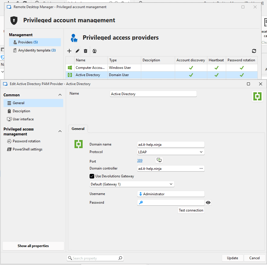 You can now configure, discover, and import accounts from Devolutions PAM directly within RDM, accommodating you wherever you want to work. You no longer need to navigate to the web interface to configure providers and propagation scripts or discover and import accounts!