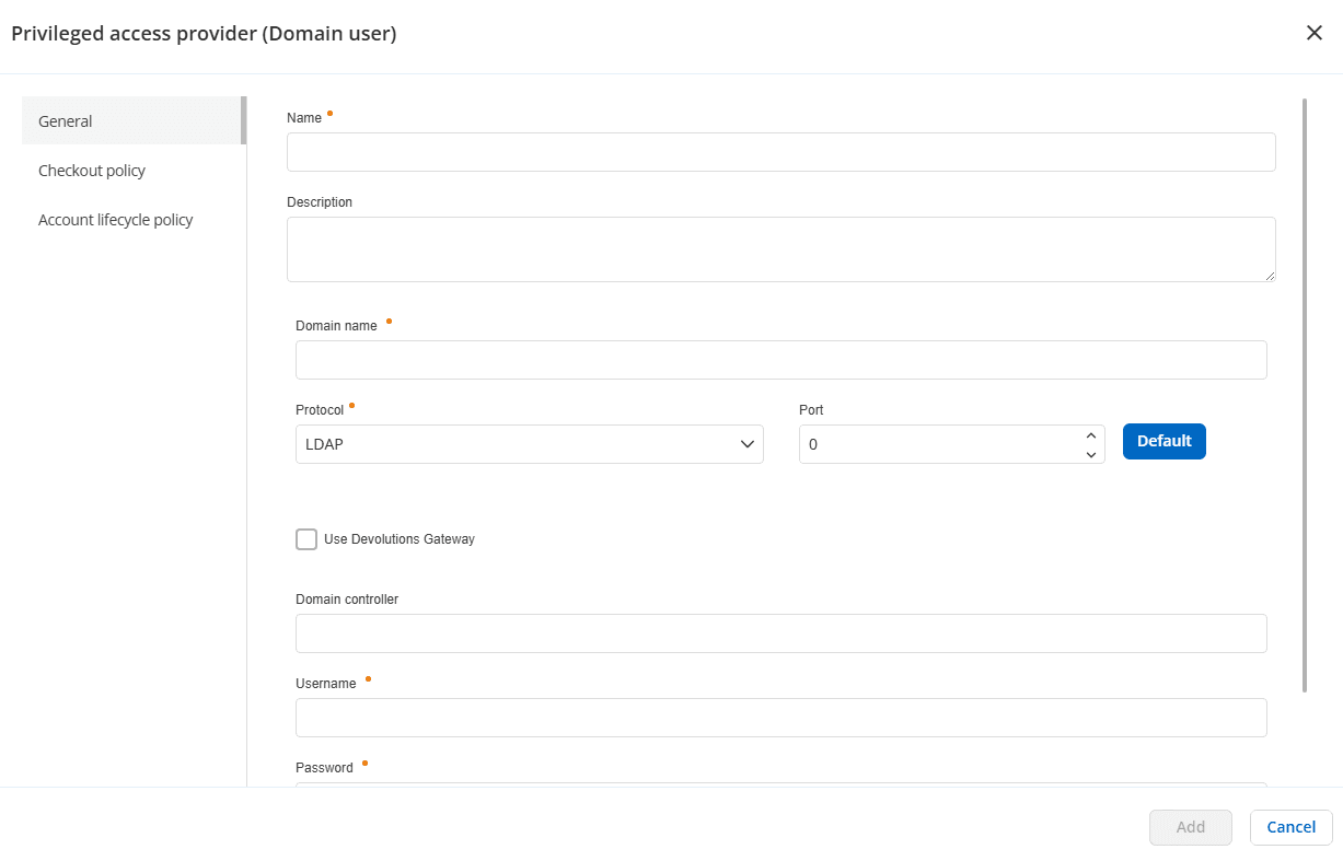 You can now use the Hub PAM provider with on-premises Active Directory, as shown above. This functionality relies on the Devolutions Hub Services, which allows the cloud-based Hub to connect to your local environment. With this enhancement, you can manage your on-premises AD accounts directly from Hub. In addition, just-in-time elevation is available for AD users as well.