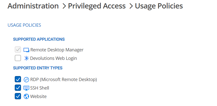 We have extended which entries can access privileged accounts within the Devolutions Server ecosystem. Along with RDP and SSH sessions, websites can now utilize privileged account credentials from a PAM vault. Administrators can also define which entry types and applications can access them in the new Usage Policies configuration page.