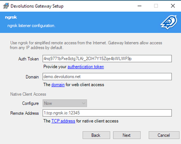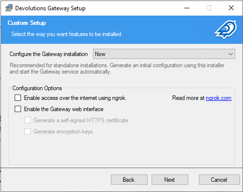 Though included in the 2023.3.0.0 release through the PowerShell cmdlets, ngrok support and be configured directly in the installer! You can use the free ngrok subscription to create a web-accessible tunnel for your Gateway or a paid subscription to take advantage of features like IP restrictions and native client access (to use Remote Desktop Manager with ngrok and Gateway).