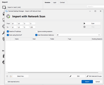 When combined with Remote Desktop Manager, Gateway can now act as a relay to discover network resources in segmented networks. Launching Remote Desktop Manager and navigating to the Import section and the option to Import with Network Scan will allow you to select Scan Devolutions Gateway and the Gateway to use.