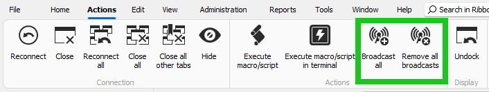 We’ve implemented two new SSH broadcasting buttons: one to broadcast all opened SSH terminal sessions in RDM, and another to remove all broadcasts. These options improve upon the existing broadcast function and makes it much easier and more intuitive to send the same command to all opened terminal sessions.