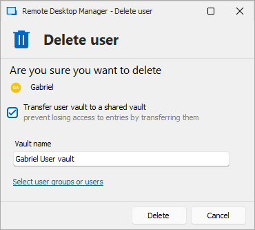 We are introducing an automated offboarding process for users within SQL Server, Devolutions Server, and Devolutions Hub (already supported) data sources. This process will allow administrators to automatically prepare and remove RDM users when they leave the team or stop using RDM, so that their licenses can be easily reassigned and their user vaults can be recovered and made into a shared vault accessible to administrators only.